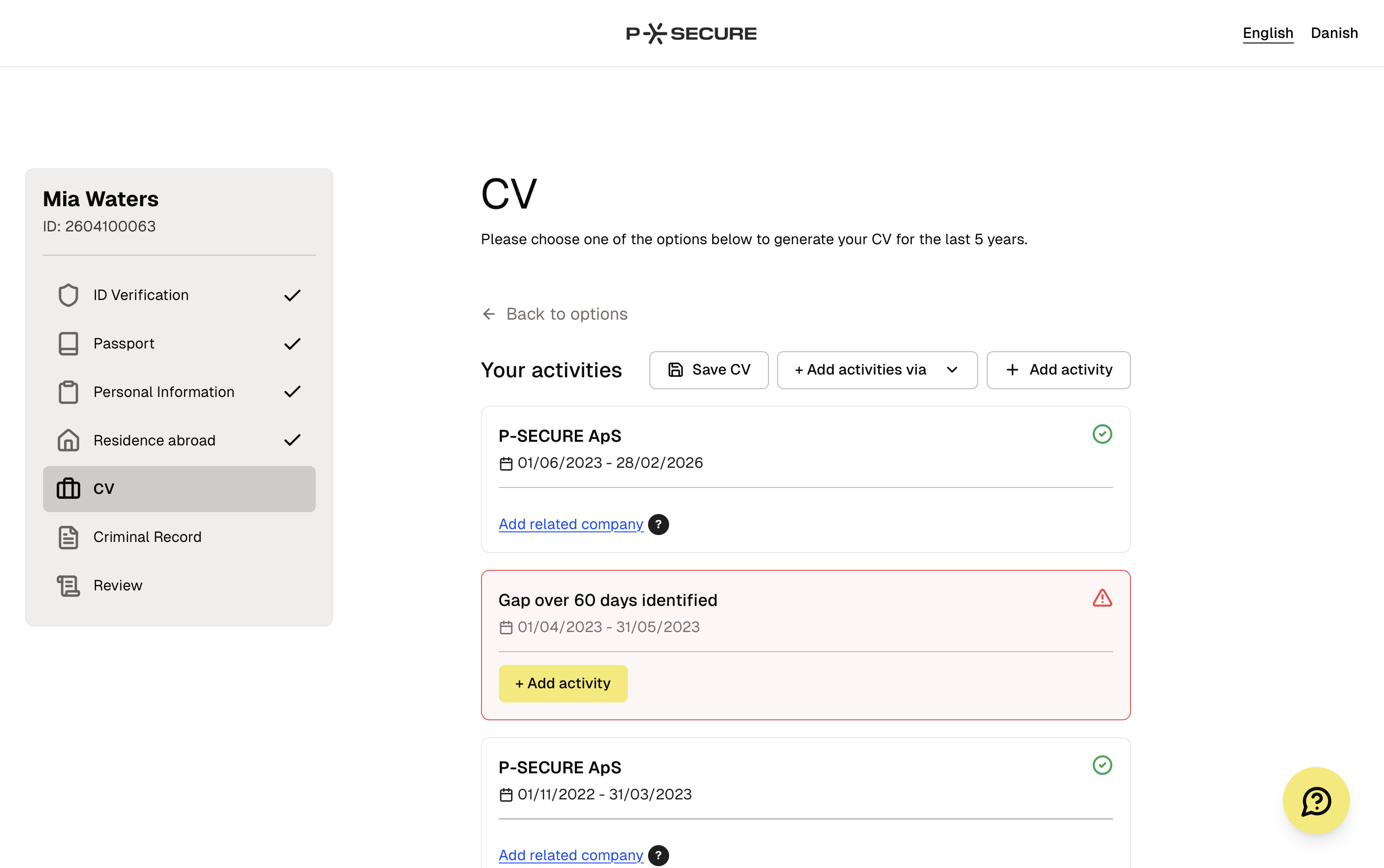 P-Secure automatiserer verifikationen af identitet, CV, strafferegistre og referencer - hvilket sikrer præcis, rettidig kontrol og reducerer risikoen for menneskelige fejl.